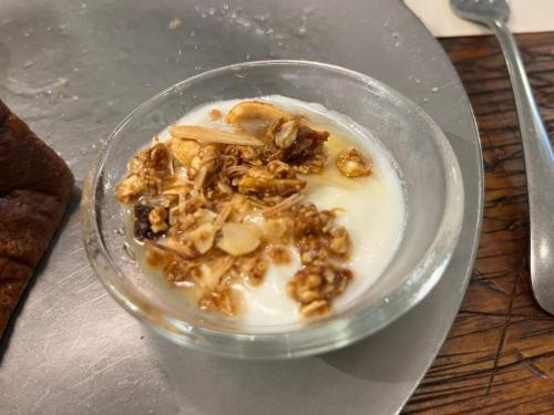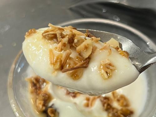 酸味のあるさっぱり系のヨーグルトにもはちみつをかけてみました。香ばしいグラノーラとの相性がよく、モーニングの食後のデザートに最適な味わいで、大満足の一皿でした。