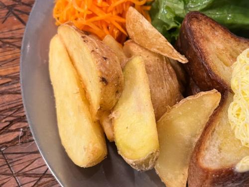 サラダはビネガーが効いたさっぱりしたドレッシングがかけられ、ポテトは優しい芋の甘さと程よい塩加減、と箸休めにとてもよかったです。