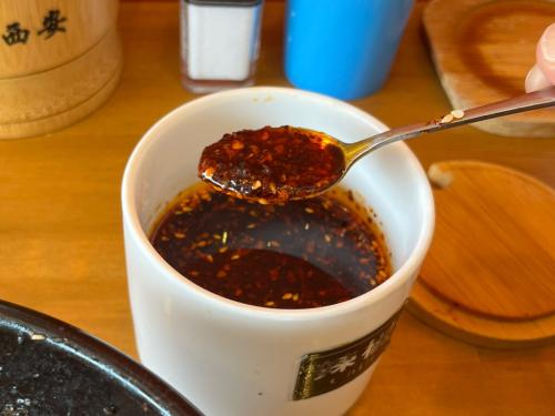 辛さが足りない方は、卓上の調味料『辣椒(ラージャオ)』で足すことができますよ。