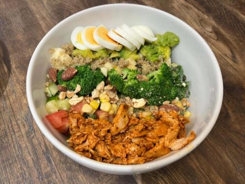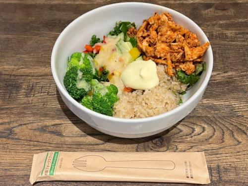 ではさっそくいただきます。フレッシュな野菜は塩こうじドレッシングで味付けされていて、シャキシャキした食感と塩味のバランスが最高!そこにもちもちプチプチの玄米の食感や蒸し鶏のスパイシーさがいいアクセントになっていて、どんどん進んでしまいました。噛み応えがある食材が多いので、満足感が高く、完食するころにはすっかり満腹。でもこれで544キロカロリー。栄養もばっちり取れる嬉しい一品です。
