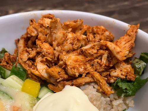 低温調理で柔らかく仕上げられたスパイシーな蒸し鶏が美味しそう!ライスは厳選された発芽玄米。食物繊維やビタミン、ミネラルなど豊富な栄養価を持ち、消化吸収しやすい体に優しい食材です。