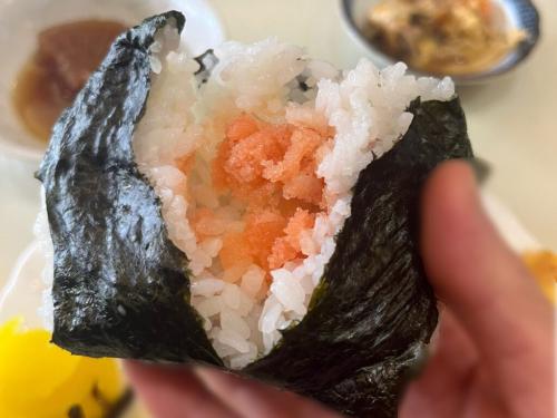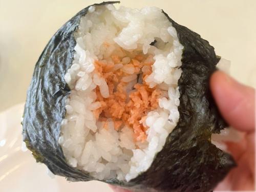 割ってみると、1つは鮭。もう一つはたらこでした。一口かじると、とてもちょうどいい握り具合。硬すぎず柔らかすぎず、口の中でほぐれていく口当たりが最高。お米屋さんということで、炊き具合も絶妙。ご飯の旨み、甘みを感じます。結構な大きさですが、中の具材との相性も良く、モリモリ食べてしまいました。