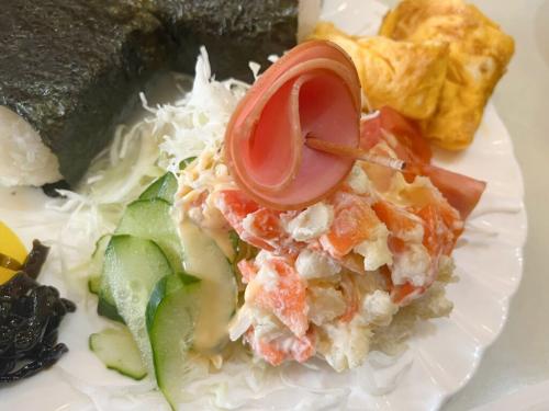 千切りキャベツは見た目以上の量で、シャキシャキフレッシュな食感。ハムは丁寧に巻かれ、プレートに彩りを添えます。ポテトサラダも手作りならではの温もりを感じる味わいでした。