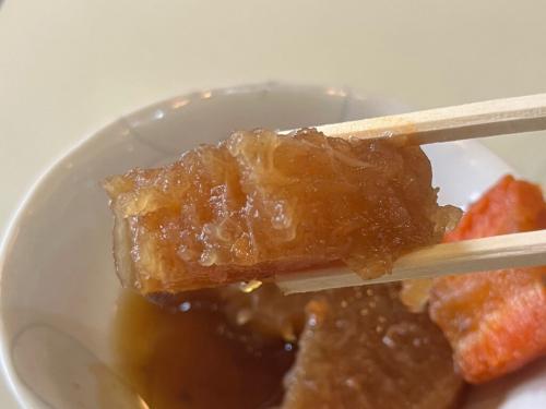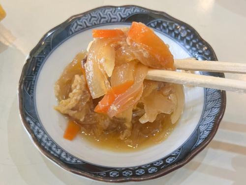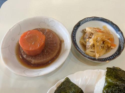 小鉢の煮物も野菜たっぷり。大根と人参は中までしっかり出汁がしみ込んでいて、じゅわっと汁がにじみ出るジューシーさ。