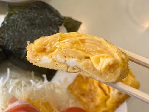 卵焼きが極上の焼き加減で、中のぷるぷるした部分と外側の香ばしい部分がたまりません。