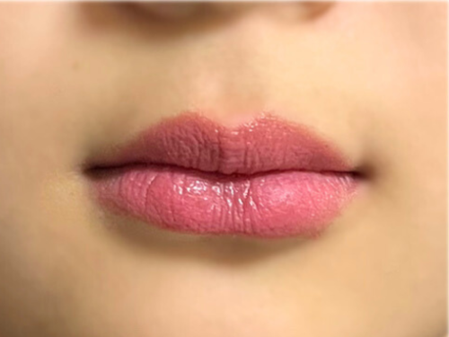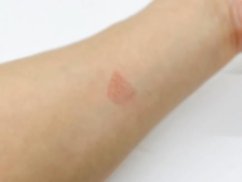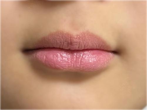 塗ってみるとこのような発色になりました。みずみずしいテクスチャーで伸びがよく、塗った瞬間はツヤを感じますが、少し経つとふわっとマットな印象に。この質感が、秋冬にピッタリ!可愛らしさと同時に大人っぽさも感じるピンク色のニュアンスがまた素敵です。