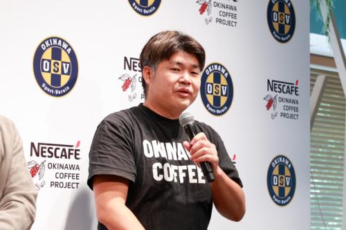 沖縄SVの髙原さんにより、2016年に発案された「ネスカフェ 沖縄コーヒープロジェクト」は、約6年半が経ち、現在では栽培場所が20か所を突破しています。この日、協力農家を代表して、又吉コーヒー園の又吉拓之さん、宮平農園の宮平翼さんの2名が登壇し、コーヒー栽培の現状などを話しました。