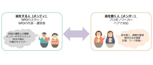 メンターは2人1組で活動し、オンラインで月2回、約3か月にわたって伴走します。形式的なアドバイスをするのではなく、相手の話を聞きながら整理を手伝い、気持ちの負担を軽くしたり、次に進むためのヒントを一緒に探したりするのが役割です。距離を置いた立場だからこそ見える視点や、生活者としての実感を持った言葉が、話し手の安心につながっていきます。
