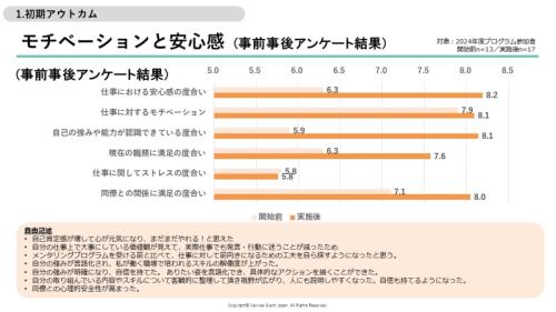 職員の変化を可視化したデータでは、「自分の強みを認識できている度合い」が最も大きく向上しており、安心感や満足度も高まっていることが示されています。誰かに話を聞いてもらえることで、自分が積み重ねてきた経験や役割の価値に気づけるようになり、それが活動全体の前向きな空気につながっていると言えます。