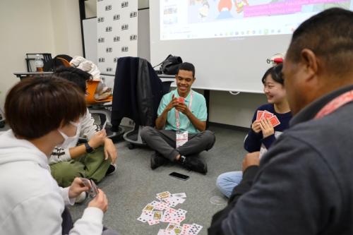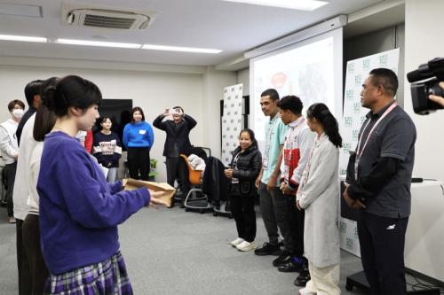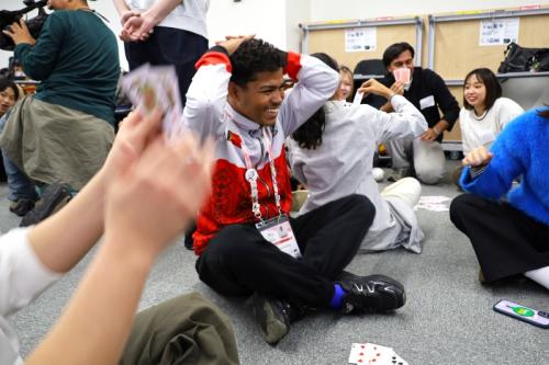 後半にはトランプゲームの「ババ抜き」が行われ、緊張がほどけた柔らかい空気が流れました。ゲームを通じて自然に笑顔が生まれ、距離が縮まっていく様子が想像できます。交流の締めくくりとして、学生たちから選手へ、東ティモールの国旗と同じ赤色のタオルと手ぬぐいが記念品として贈られました。小さな贈り物の中にも、敬意と応援の気持ちが込められているように感じられます。