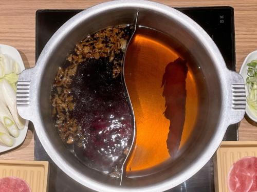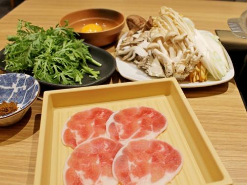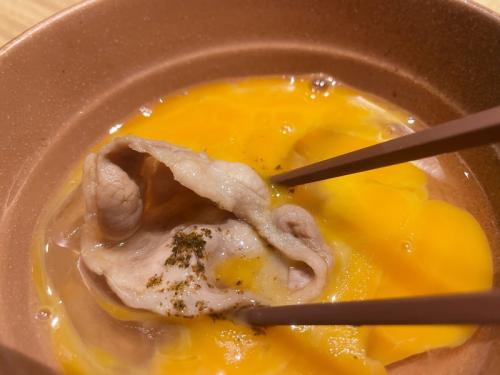 だしは、黒糖とたまり醤油を使用し、焦がし玉ねぎの香ばしさと甘み、鴨脂のコクを加えた旨みあふれる“鴨すきだし”。鴨肉をくぐらせ、ほんのり色が変われば食べごろです。