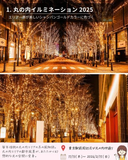 丸の内エリアでは、シャンパンゴールドに輝くイルミネーションが冬の風物詩。