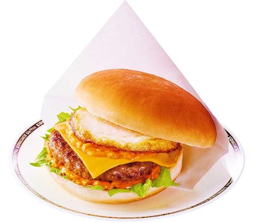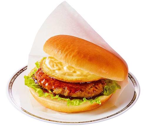 コメダ珈琲店自慢の大きなバンズに、とろ~りエッグオムレツ、特製てりやきソース、ハンバーグ、レタスを挟み、マヨネーズをトッピング。