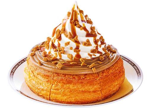ほろ苦いココアバウムクーヘンに、マロンクリーム、ソフトクリーム、キャラメルソースをまとわせ、トッピングに香ばしいクッキーをあしらった品。