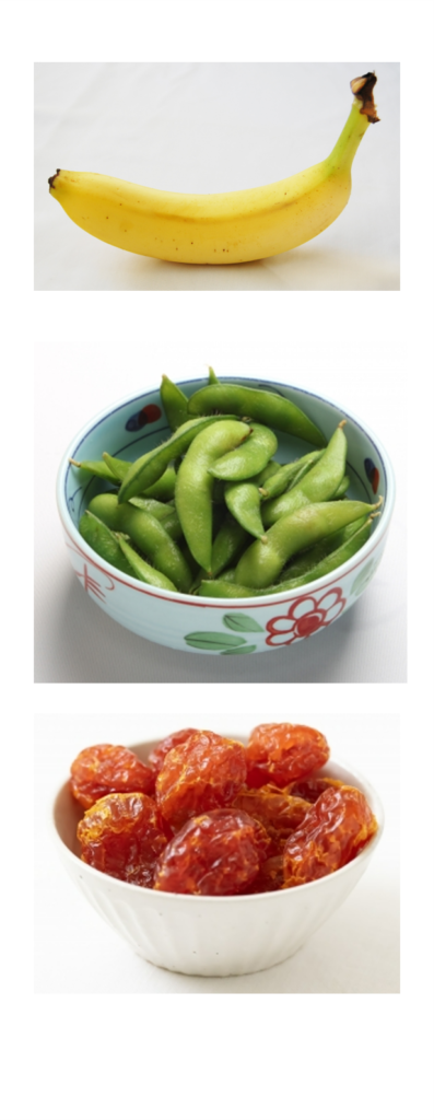 カリウムはバナナ、えだまめ、ズッキーニ、トマトなど、様々な野菜や果物に含まれており、普段の食事で補うことが可能。
