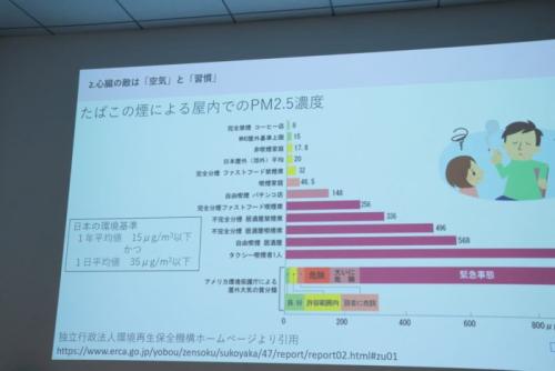 完全分煙のファーストフード店の禁煙席でも基準値ギリギリの濃度となり、完全禁煙のコーヒー店(喫茶店)でも数値は8μg/m³と0にはならないだけでなく、不完全分煙の店舗などでは一気に数値が高くなると、タバコによるPM2.5濃度の高さをわかりやすく説明してくれました。