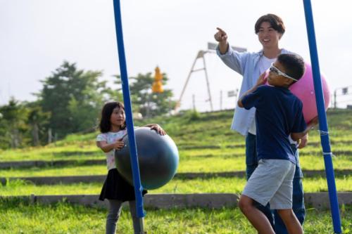 「しばふ広場ASOBIBA」は、多彩な遊び道具が集まる広大な芝生の広場。大きなボールを使って遊ぶエリアや、モルックなどの外遊びグッズを揃えるエリアを配置。楽しみながら学べる広場です!