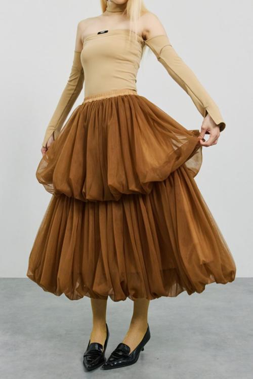 「Jellyfish Tulle skirt」は、ジェリーフィッシュという名前の通り、クラゲを思わせる揺らめきが美しいスカート。ライトブラウン、ホワイト、ブラックの3種類のカラーのうち、ライトブラウンはショップ先行カラー。
