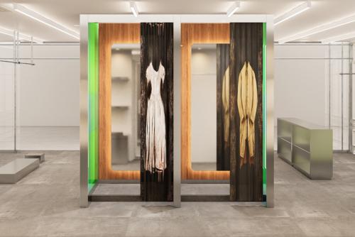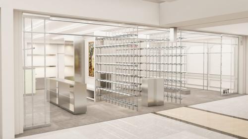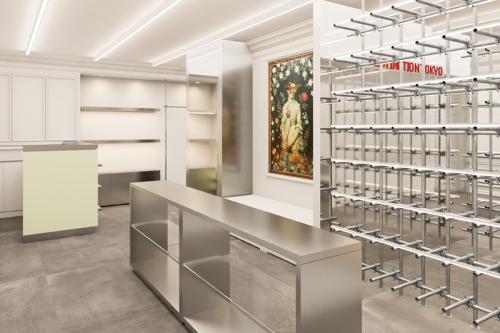 店内は映画のワンシーンのような空間に刷新。スタンリー・キューブリック監督のSF映画「2001年宇宙の旅」に登場する「ベッドルームシーン」から着想を得たのだとか。18世紀フランスのネオクラシカル様式とミニマリズムを融合。モダンでインダストリアルな雰囲気を演出。クラシックさを引き立たせる一方、メタル素材やクリアな什器がアヴァンギャルドな雰囲気も醸し出しています。