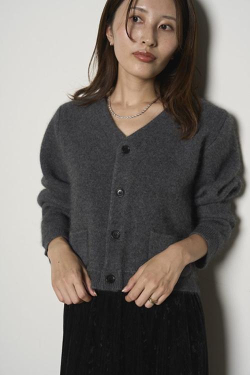 「ウォッシャブルコンパクトシャギーVネックカーデ」は、MIESROHE定番のラクーン混のシャギーニットカーディガン。今季はコンパクトなサイズ感そのままに、襟もとをVネックにして一枚着として着られるデザインに変更。左右の小ぶりなポケットがさりげないアクセント。表参道ヒルズ限定カラーとしてグレーを用意。