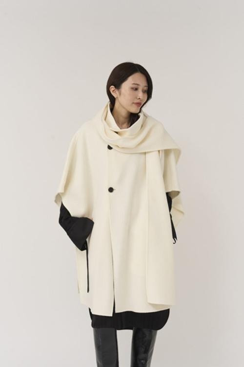 オープンを記念し、人気アイテムから表参道ヒルズ店限定カラーを販売。「接結フードポンチョコート」はブランドの代名詞と言えるポンチョコートで、今季は取り外し可能なフード付きにアップデート。上質なメリノウール2重織り素材を使用。軽やかな着心地が特徴。表参道ヒルズ店限定カラーとしてホワイトを用意。