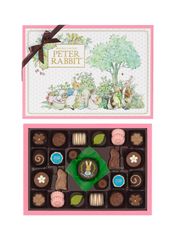 プリントチョコレートをアイキャッチに、ピーターラビットをかたどったチョコレートや、物語の舞台となった湖水地方の自然をモチーフにしたチョコレートなどのアソートメントです。