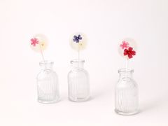 「エディブルフラワー」【「edible」=食べられる「flower」=お花】最近、SNSでも注目を浴びている、食用のお花のこと。観賞用とは違い野菜と同じように、安心して食べるためにつくられた花です。美しさをそのままに、ドライされたエディブルフラワーを、ビーテック独自の技術により、ロリポップキャンディに閉じ込めました。