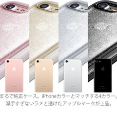 iPhoneのカラーに合わせて、ピンク、ゴールド、シルバー、ブラックの4色展開。上品にちりばめられたラメが、大人びた印象と共にかわいらしさを演出します。Appleのロゴが透けて見えるのもポイントです。