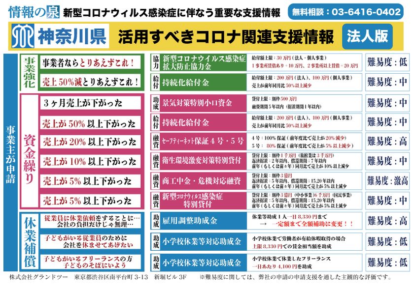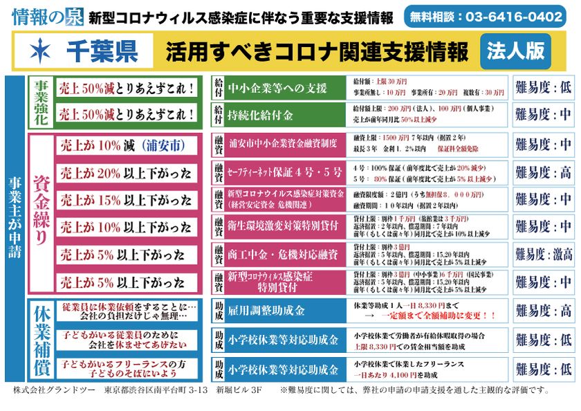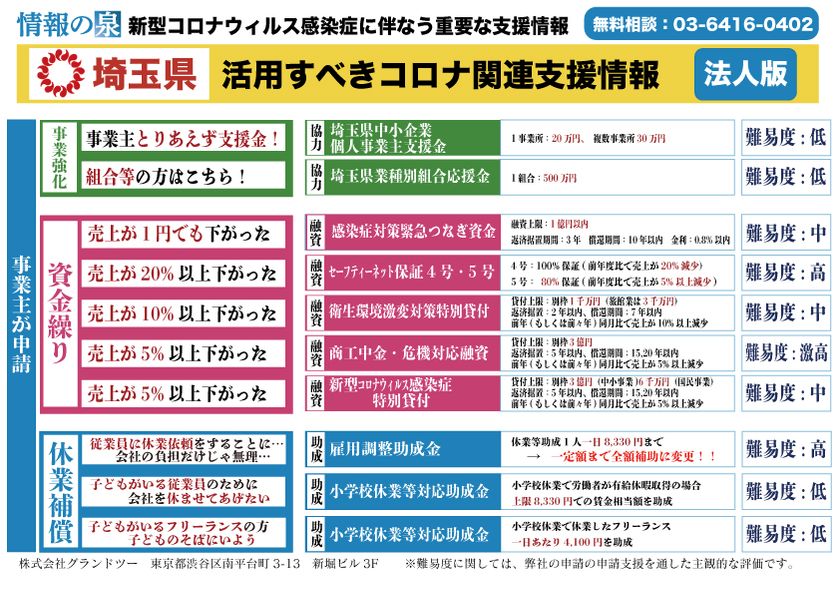 金融機関、大手保険会社、上場企業、社労士法人、税理士法人等、140社以上が利用する、日本最大級の支援情報自動マッチングシステムを運営する、株式会社グランドツー(代表取締役:出口 グラウシオ)は、自治体省庁の支援情報を自動検索・自動マッチング・自動パンフレット機能を活用し、各自体の支援情報を公開致します。