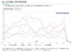 特許データは最新の各国特許庁発行の特許データに基づき集計・解析・分析を行ったものです。分析データ・グラフなどの各種パテントマップはSVG、PNG、JPG形式などの各種画像形式のほか、CSV形式などでも取得することができ、社内資料、各種プレゼン資料などで簡単にご活用いただくことができます。