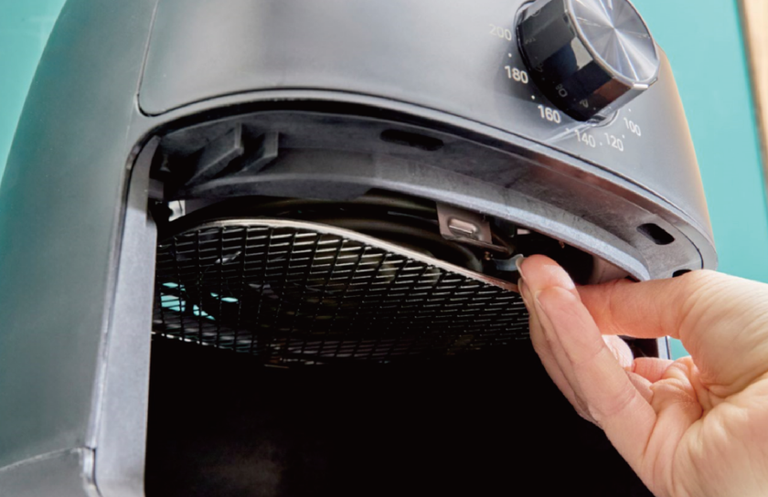 軽量でコンパクトなバスケットと、ヒーターへの油跳ねを軽減する「ヒーターガード」は、取り外し可能で、この2つを洗うだけでOK!油を使わないから、油の後始末やコンロ回りへの飛び跳ねの心配もありません。