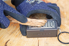一本の枝から生まれる「火の素(ひのもと)」を、千切りスライサーのような要領で削り、メタルマッチで点火する──その一連のプロセスを、誰でも安全かつ確実に行えるようにデザインされています。