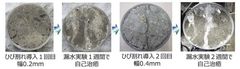 AH株と栄養素を添加したバイオスマートコンクリート(R)で作製した供試体で漏水実験を行った結果、繰り返し導入したひび割れが自己治癒され、漏水が止まったことを確認しています(写真1)。