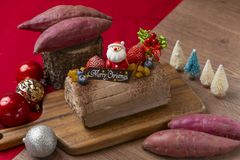 鳴門金時芋餡をしっとりとしたスポンジにチョコクリームでくるりと巻き、上には徳島県産いちごと大学芋を飾ったロールケーキです。チョコ生クリームをたっぷりと使いました。