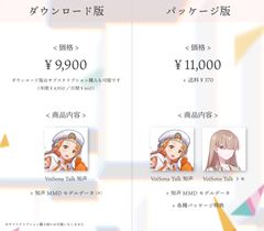 パッケージ版にはトークボイスライブラリがもう一種(『VoiSona Talk トモ』)、限定特典として付属いたします。また、パッケージ版およびダウンロード版(買切プランのみ)ともに購入特典として、知声MMDモデルデータ(本製品ビジュアルver)が付属します。