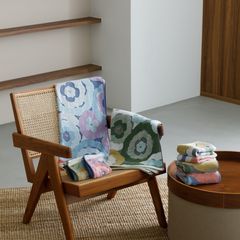 七福タオルの得意とする多色ジャガード技術を生かし、多彩な花柄を美しく表現するために、数多くの試作と調整を重ねています。複数の色糸を織り込むことで生まれる奥行きや立体感を引き出しつつ、デザインだけでなく素材選びにもこだわり、やわらかな素材感を損なわないバランスを追求しました。細部まで丹念に作り込むことで華やかな見た目と心地よい使い心地を兼ね備えた、上品で日常に寄り添う一枚が完成しました。