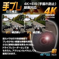 前カメラはEIS防振機能でブレの少ない綺麗な映像を実現。さらに鮮明な画質を誇る4K対応。ドライブレコーダーとしてはもちろん、アクションカメラとしても使用できます。