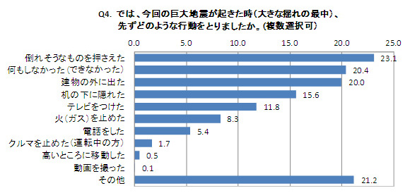 Q4.では、今回の巨大地震が起きた時(大きな揺れの最中)、先ずどのような行動をとりましたか。(複数選択可)