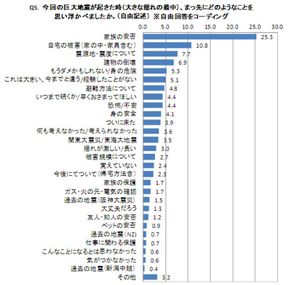 大きな揺れが起きた際の真っ先に思い浮かべたことを自由回答で尋ねたところ、「家族の安否」が25.3%で最も多く4人に1人の割合。次いで「自宅の被害(家の中・家具含む)」の10.8%、「震源地・震度」の7.7%と続く。