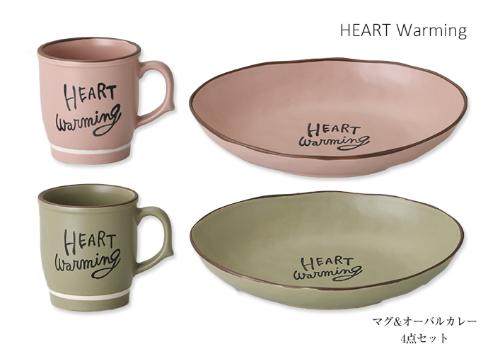 「HEART Warming」は岐阜県土岐市で作られる美濃陶磁の伝統工芸技術を取り入れた食器シリーズで、ぽってりとしたフォルムのアースカラーが特徴で、手描き風のメッセージが心も体も温めます。