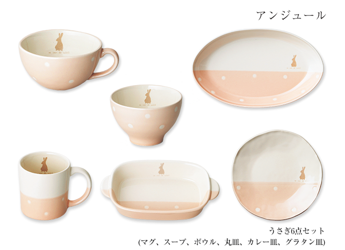 ●アンジュール うさぎ食器6点セット(マグ、スープ、ボウル、丸皿、カレー皿、グラタン皿)