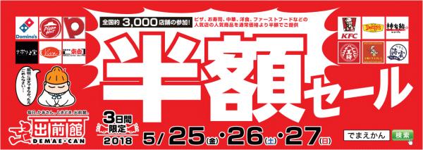 夢の街創造委員会株式会社(代表取締役社長:中村利江、本社:大阪府大阪市)が運営する日本最大級の宅配ポータルサイト『出前館』は、2018年5月25日(金)より3日間限定で、「リベンジ半額セール」を開催します。今回は、2018年2月開催時に発生したシステム課題を改修し、お詫びの気持ちを込めて臨時で開催いたします。