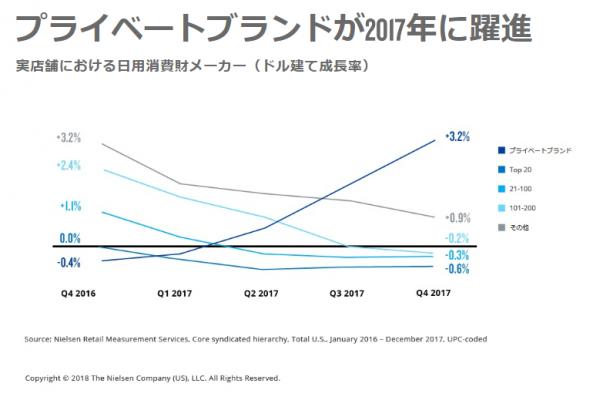 チャネルを問わず、プライベートブランド(PB商品)は流通小売における重要性を再定義しつつ2017年を通じ成長を牽引しました。PB商品は金額において前年対比3%以上成長しつつ、実店舗において1,250億ドル(約13兆円)もの日用消費財売上を占めるに至りました。とはいえ、すべてのPB商品が同様に成長を牽引しているわけではありません。また、すべてのNB商品が売上を落としているわけでもありません。