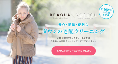 また、YOSOOUオンラインショップで商品を30,000円(税別)以上ご購入いただいた場合は、リアクアのクリーニングで利用できるギフトコード(e-Gift)2,500円分をプレゼントいたします。