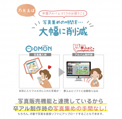 本連携により、「夢ふぉと」で提供する卒園・卒業アルバム専用「らくらく制作ソフトMyself」を使用し、「コドモン」の写真販売画面から保護者がお気に入り登録した写真を集め、卒園アルバムを作る事ができるようになります。(手動でその他の写真をアップロードすることも可能)