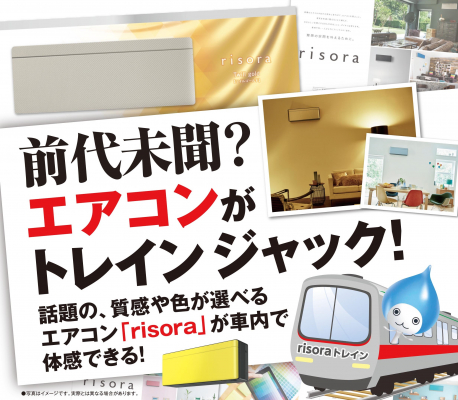 今回実施するトレインジャックは中吊り、ドア横ポスター、まど上ポスターなど車両全てをダイキンのエアコン「risora」広告に。