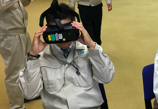 前田建設工業株式会社中部支店で行われた、防災訓練に、火災現場をVRで体験できる「防災VR for Mobile 火災編」体験ブースを設置。