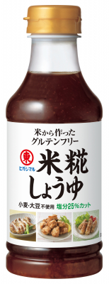 「米糀しょうゆ」は、小麦、大豆を使わず国産米を発酵させてつくった、グルテンフリーの新しいしょうゆ風味の調味料です。米を特別に使用するヒガシマル醬油ならではの米発酵技術から生まれました。普通の濃口しょうゆに比べて塩分を25%カットしています。