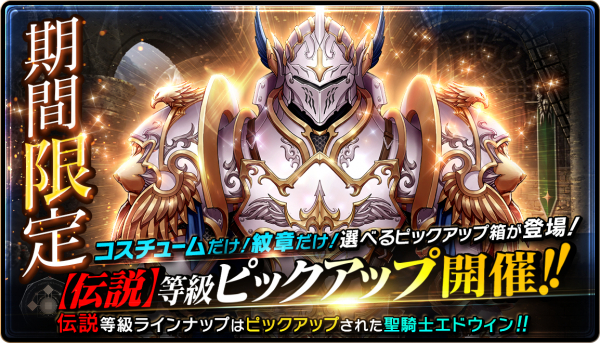 また、コスチュームや様々なアイテムが手に入るログインボーナスとイベントが同時開催となっているほか、期間限定で「聖騎士エドウィン」のコスチュームもしくは紋章を獲得することができる【伝説】等級ピックアップも開催中となっております。ぜひご注目ください。