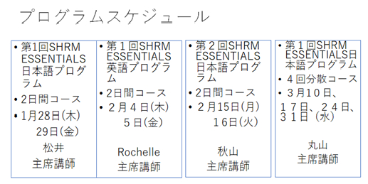1月より毎月SHRM Essentialsプログラムを開催して参ります。現在開催が決定している1月以降のプログラムは、2月4日(木)5日(金)第1回SHRM Essentials英語プログラム2日間コース、2月15日(月)16日(火)第2回SHRM Essentials日本語プログラム2日間コース、3月10日17日24日31日毎週水曜日午後に第1回SHRM Essentials日本語プログラム4回分散コースとなります。4月からはSHRM Essentialsバイリンガルプログラム、インストラクター養成プログラムも順次開催いたします。